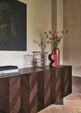 Calligaris Réf. CS6210-1 Dimensions : l 181 x h 78 x p 50 cm La porte Intarsi se distingue par un travail particulier qui rappelle la technique artisanale de l'incrustation. Le bois est l'élément central, apportant chaleur et beauté aux salons les plus sophistiqués. buffet