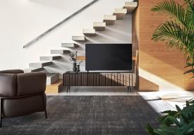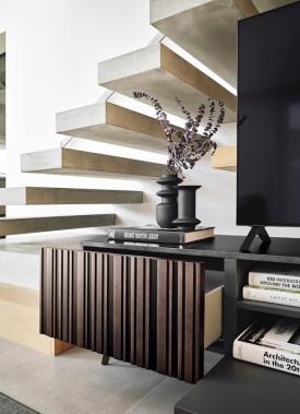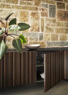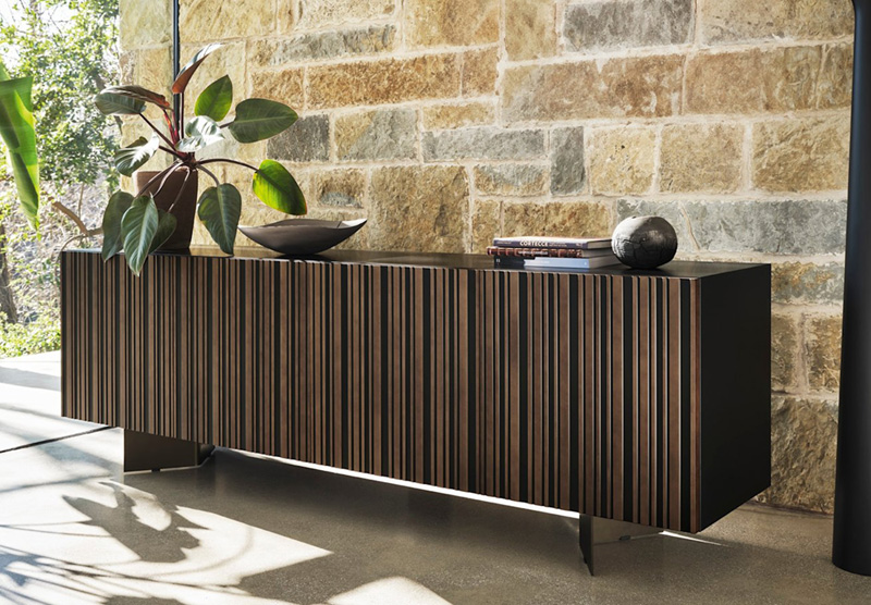 La porte Stripes présente un motif de bandes verticales irrégulières. La finition en bronze brossé crée un jeu de volumes et de profondeur qui définit l'esthétique du buffet, en faisant un point focal du salon.