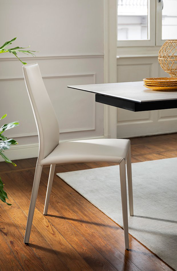 Calligaris Design. Gino Carollo - Réf. CS1484 Dimensions : l 44 x h 94 x p 57 cm La chaise AIDA, un succès des collections Calligaris, est proposée dans cette version entièrement revêtue de cuir véritable qui exalte son raffinement. Avec son design minimaliste et raffiné, la chaise AIDA se distingue par son dossier haut et sa ligne élancée. Disponible dans des coloris naturels et raffinés avec les coutures assorties, AIDA est la chaise qui aménage avec élégance et personnalité le coin-repas.