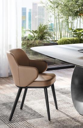 La nouvelle chaise rembourré FOYER apporte confort et détente à ceux qui s’y abandonnent. Cela est dû à la coque enveloppante et rembourrée en multiplis courbé et à l’assise souple avec structure en sangles élastiques, soutenue par un élégant piètement en bois composé de quatre pieds coniques, dont les tons se marient avec les finitions de la coque.
