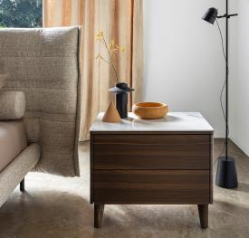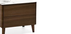Table de chevet modèle BOSTON avec structure en bois à deux tiroirs. BOSTON est une table de chevet au design linéaire et moderne. Les tiroirs sans poignées s’ouvrent grâce à un système « push-pull » et sont équipés d’un mécanisme de fermeture amortie. Les pieds sont en bois dans une finition coordonnée ou en aluminium, au choix.