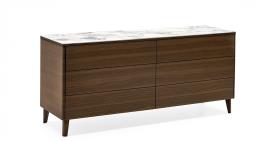 commode modèle BOSTON à 6 tiroirs pour la chambre, avec structure en bois. BOSTON est une commode au design linéaire et moderne. Les tiroirs sans poignées s’ouvrent grâce à un système « push-pull » et sont équipés d’un mécanisme de fermeture amortie. Les pieds sont en bois dans une finition coordonnée ou en aluminium, au choix.
