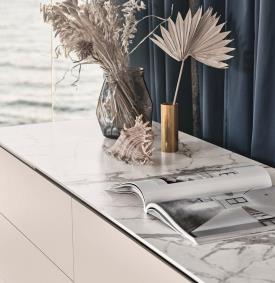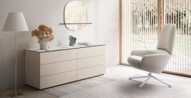 commodes entourant le lit dans l'espace nuit, qui changent de style en fonction de la grande variété des finitions et du design des façades qui peuvent être lisses ou travaillées, laquées ou en bois naturel. Les tiroirs sont dotés d'un système d'ouverture push & pull