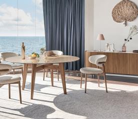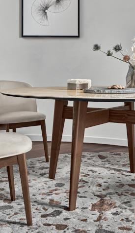 ABREY est une table fixe élégante et solide caractérisée par une base en frêne massif à section arrondie. L’aspect essentiel de la structure confère une élégance extrême à la table et souligne l’aspect unique des plateaux, qui diffèrent à la fois par leurs dimensions, leur forme et leurs matériaux.