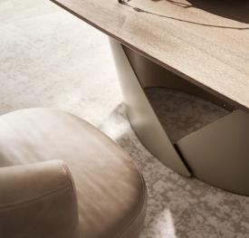 Une table importante, conçue pour être le protagoniste du salon contemporain. Calla se distingue par sa base qui rappelle une fleur : solide mais en même temps légère, elle est constituée de deux lames de métal qui s'emboîtent comme des pétales, créant une forme de calice qui s'ouvre vers le haut, suggérant vitalité et renaissance.