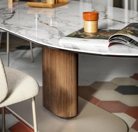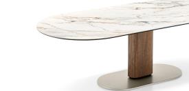 CAMEO est une table fixe aux lignes ovales bien définies qui lui confèrent une forte personnalité, garantissent sa stabilité et permettent d’optimiser au maximum les espaces situés sous le plateau. La colonne centrale, en métal teinté, soutient les différents types de plateaux : la combinaison métal / bois est toujours raffinée et le métal / céramique à effet marbre, qui joue sur la combinaison des matériaux froids et chauds, est très contemporain.