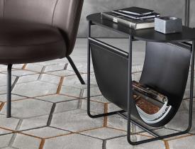 Table basse réalisée en tubes de métal de de diamètre, avec plateau en bois ou en céramique. Sac porte-revues situé sous le plateau. Essentielle tout en étant élégante, sa structure en métal est associée à un plateau elliptique composé de matériaux variés. Le porte-revues prend un aspect sophistiqué et discret.