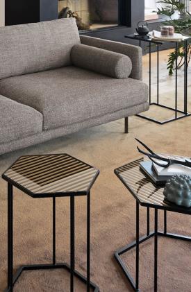 RENEE, une collection de tables basses disponibles en différentes formes géométriques, dimensions et hauteurs. Les plateaux, hexagonaux et carrés, sont proposés en verre miroir avec un agréable effet de vagues ou en céramique. Le dessin de ce modèle propose un compromis équilibré entre lignes minimalistes et le raffinement que rendent ces tables facilement adaptables à toutes les exigences