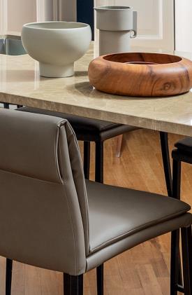 La collection Carmen se caractérise par des lignes élancées et minimalistes. Les pieds en métal sont fins, tout comme l'épaisseur de l'assise et du dossier, rendus confortables par le rembourrage avec coussin fixe qui crée un pli intéressant au niveau du dossier.