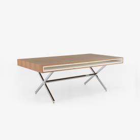 La réédition du bureau Président, dessiné par Pierre Guariche, fait revivre ce modèle emblématique des premières gammes de mobilier d’entreprise et de collectivité. Conçu à l’origine pour le bureau de direction générale et édité en petite série par Les Huchers-Minvielle, principal éditeur de Guariche aux côtés de Meurop. Le bureau Président se distingue par sa finition en noyer teinte naturel, ses deux tiroirs à coulisses à sortie totale côté président, sa niche en stratifié blanc côté invité, ses poignées cuvette chromées et ses pieds chromés brillants avec patins réglables en hauteur.