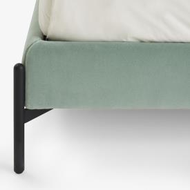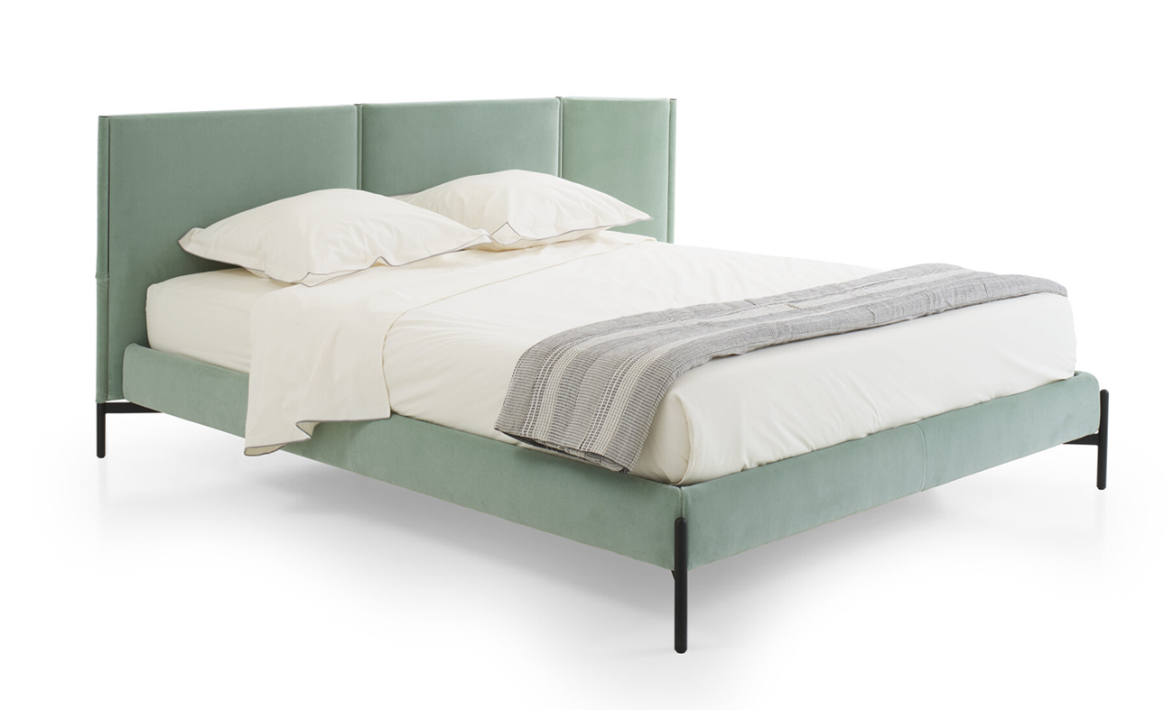Cadre de lit en tube métallique et panneaux Multiplis. Cadre parementé de mousse polyuréthane 50 kg/m3 - 3,9 kPa recouverte de ouate polyester 110 g/m². Tête de lit en tube métallique et panneaux de MDF parementée de mousse polyuréthane 50 kg/m3 – 3.9 kPa recouverte de ouate polyester 110 g/m². Piètement métallique laquée époxy noir mât. Possibilité d'intégrer tout type de sommier encastrable.